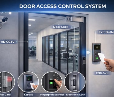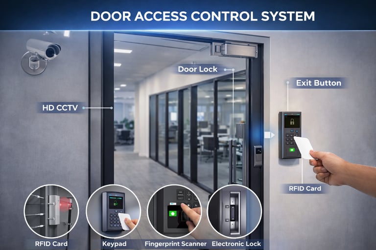 Door Access Control Systems (DACS) regulate and monitor entry and exit across single or multiple doors, ensuring access only to authorized individuals. DACS supports multiple authentication technologies including RFID and smart cards, biometrics (fingerprint, face, palm), PINs, QR codes and mobile-based credentials.