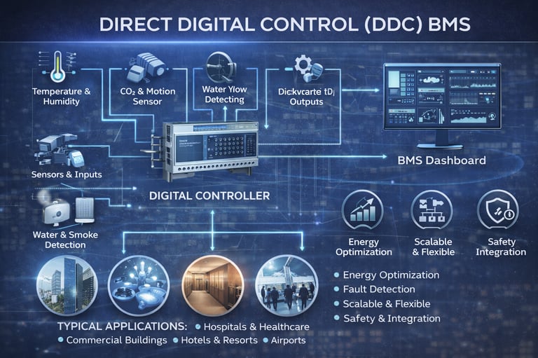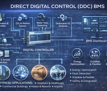DDC BMS is a modern building automation system that uses digital controllers, sensors and actuators to continuously monitor, control and optimize building subsystems such as HVAC, lighting, energy management and safety systems. Unlike legacy analog systems, DDC allows precise, automated control through programmable logic and real-time digital communication.