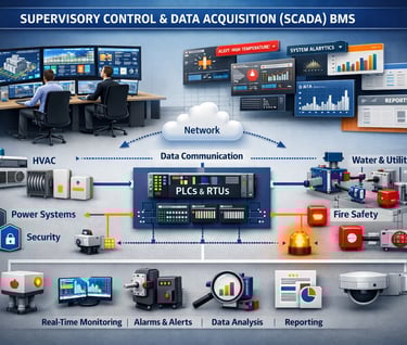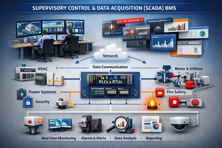 Supervisory Control and Data Acquisition (SCADA) BMS is an advanced building and infrastructure management system designed for centralized monitoring, supervisory control and data analysis of large, complex and mission-critical facilities. SCADA systems collect real-time data from multiple subsystems and enable operators to supervise operations from a unified control platform.