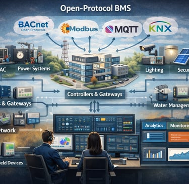 Open-Protocol BMS are building automation platforms designed to integrate and manage multiple building systems using non-proprietary, industry-standard communication protocols. These systems enable seamless interoperability between equipment and controllers from different manufacturers, ensuring flexibility, scalability and long-term system viability.