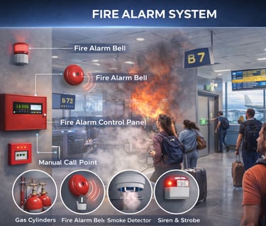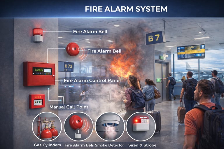 Fire alarm systems are the first line of defense against fire, designed to detect smoke, heat, and flames and alert occupants and emergency responders through audible and visual alarms. They consist of detectors, manual call points, control panels, and notification devices, operating through conventional or addressable systems with centralized monitoring.