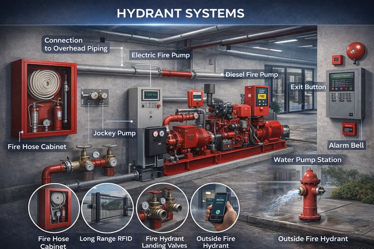Fire Hydrant Systems form a critical component of a facility’s active fire protection strategy, providing a reliable and high-capacity water supply for firefighting operations. Designed to support both internal and external fire response, these systems enable rapid intervention to control and suppress fires before escalation.